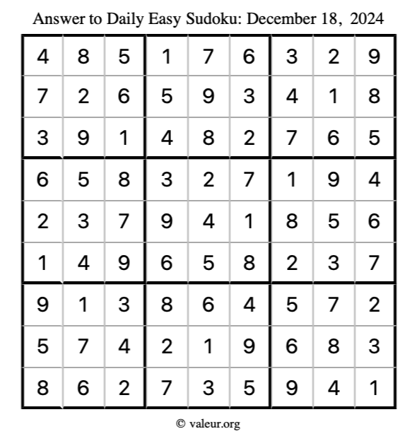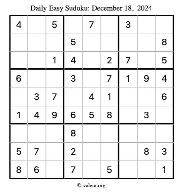 Here is the December 18, 2024 easy sudoku puzzle. You are welcome to print a copy to solve by hand. For your convenience, we have also included the solution further down the page so you can check your work.