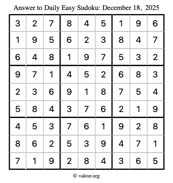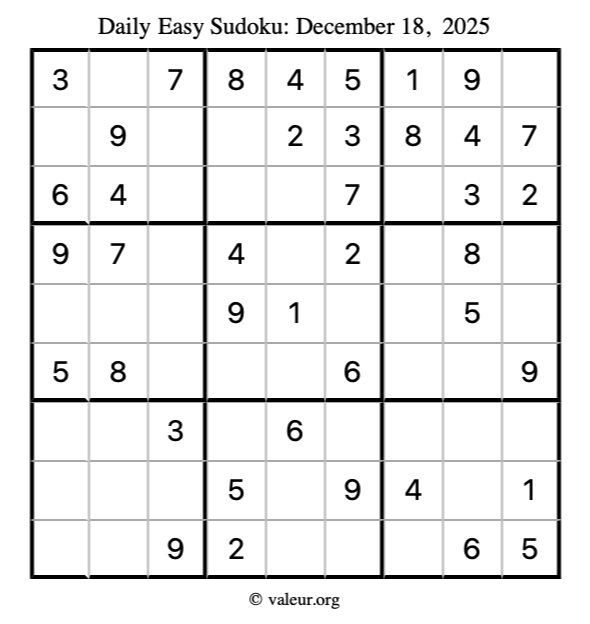 Here is the December 18, 2025 easy sudoku puzzle. You are welcome to print a copy to solve by hand. For your convenience, we have also included the solution further down the page so you can check your work.
