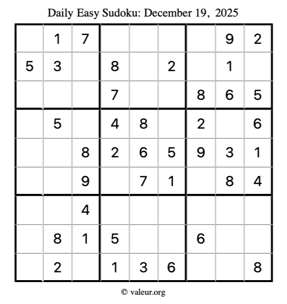 Here is the December 19, 2025 easy sudoku puzzle. You are welcome to print a copy to solve by hand. For your convenience, we have also included the solution further down the page so you can check your work.