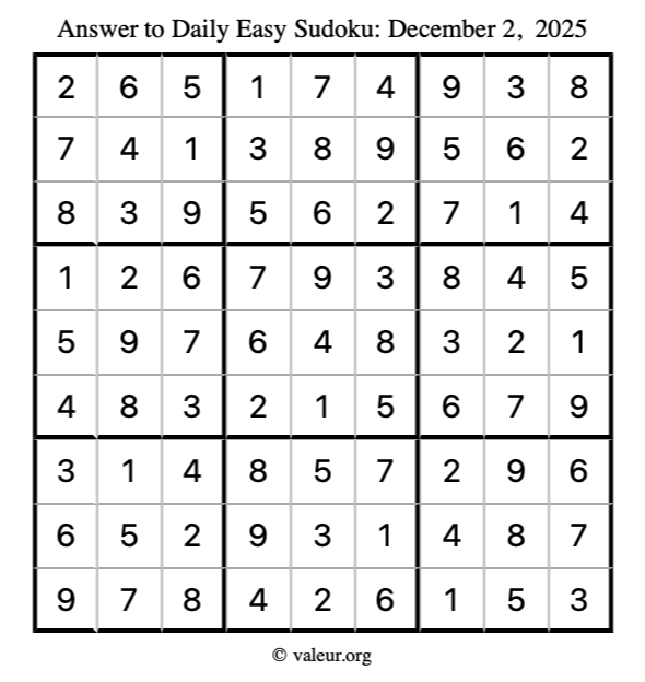 As promised, here is the solution to the December 2, 2025 easy sudoku puzzle: