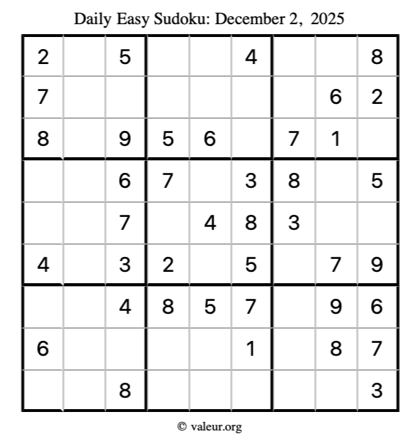 Here is the December 2, 2025 easy sudoku puzzle. You are welcome to print a copy to solve by hand. For your convenience, we have also included the solution further down the page so you can check your work.