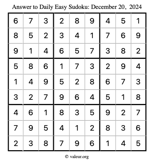 Here is the December 20, 2024 easy sudoku puzzle. You are welcome to print a copy to solve by hand. For your convenience, we have also included the solution further down the page so you can check your work.