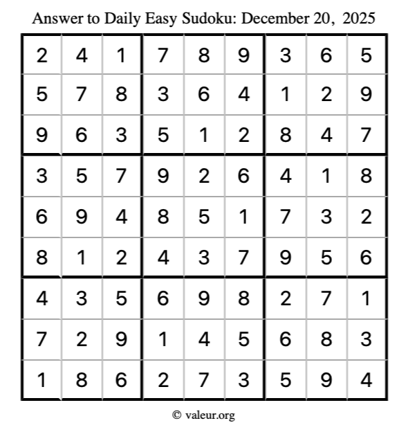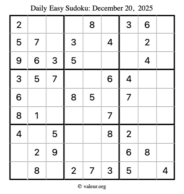Here is the December 20, 2025 easy sudoku puzzle. You are welcome to print a copy to solve by hand. For your convenience, we have also included the solution further down the page so you can check your work.