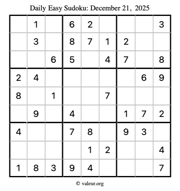 Here is the December 21, 2025 easy sudoku puzzle. You are welcome to print a copy to solve by hand. For your convenience, we have also included the solution further down the page so you can check your work.