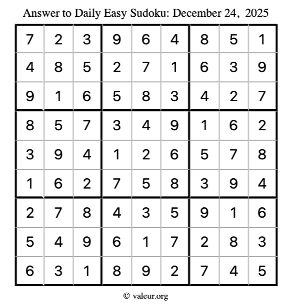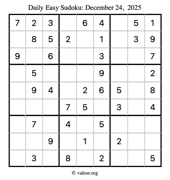 Here is the December 24, 2025 easy sudoku puzzle. You are welcome to print a copy to solve by hand. For your convenience, we have also included the solution further down the page so you can check your work.