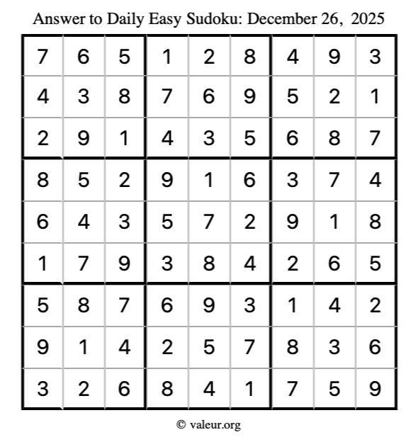 As promised, here is the solution to the December 26, 2025 easy sudoku puzzle: