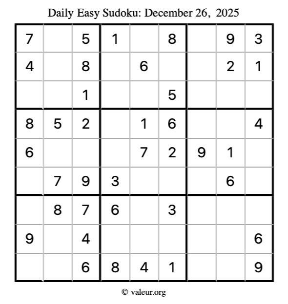 Here is the December 26, 2025 easy sudoku puzzle. You are welcome to print a copy to solve by hand. For your convenience, we have also included the solution further down the page so you can check your work.