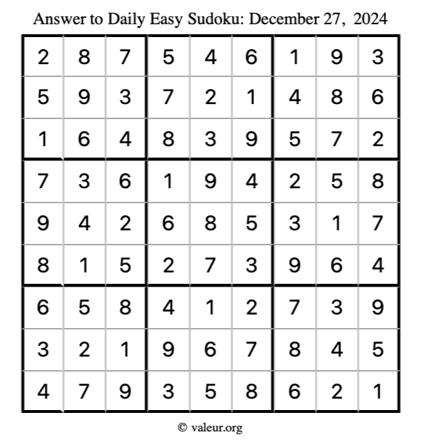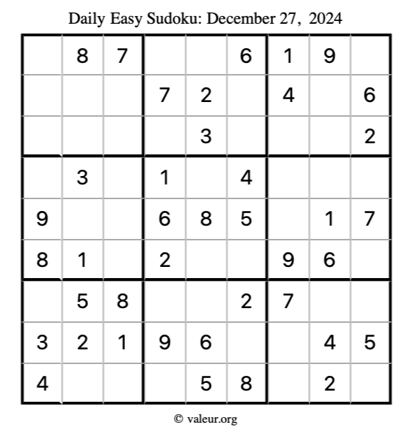 Here is the December 27, 2024 easy sudoku puzzle. You are welcome to print a copy to solve by hand. For your convenience, we have also included the solution further down the page so you can check your work.
