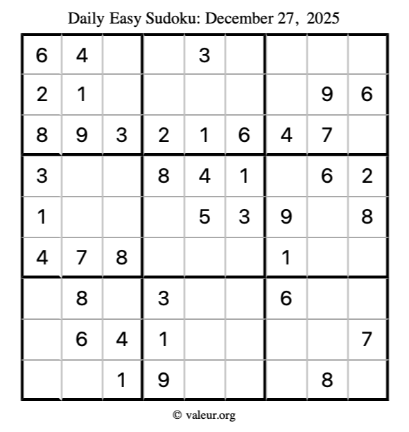 Here is the December 27, 2025 easy sudoku puzzle. You are welcome to print a copy to solve by hand. For your convenience, we have also included the solution further down the page so you can check your work.