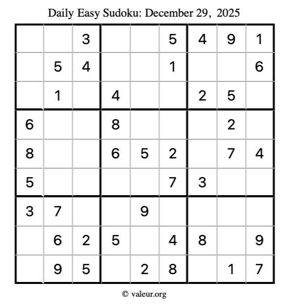 Here is the December 29, 2025 easy sudoku puzzle. You are welcome to print a copy to solve by hand. For your convenience, we have also included the solution further down the page so you can check your work.