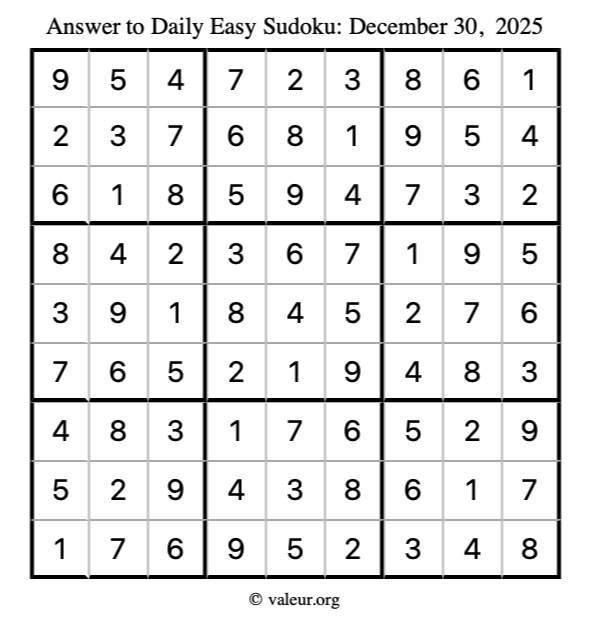 As promised, here is the solution to the December 30, 2025 easy sudoku puzzle:
