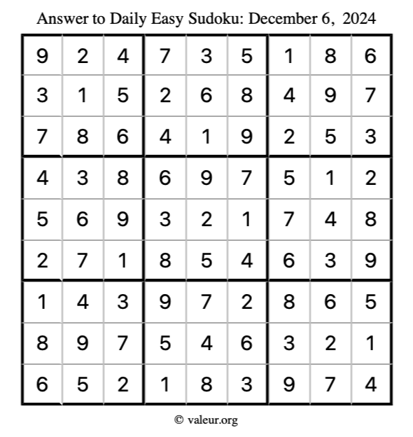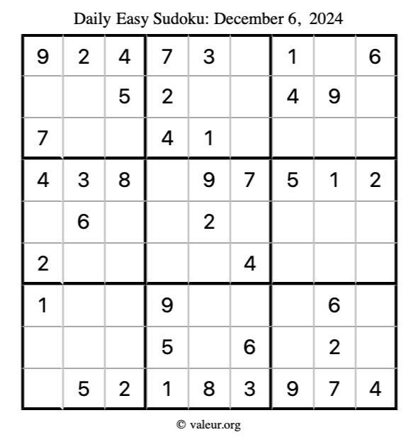 Here is the December 6, 2024 easy sudoku puzzle. You are welcome to print a copy to solve by hand. For your convenience, we have also included the solution further down the page so you can check your work.