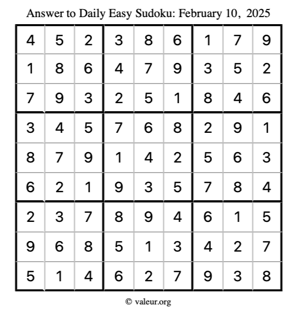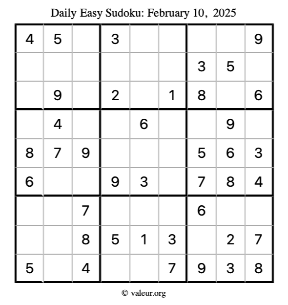 Here is the February 10, 2025 easy sudoku puzzle. You are welcome to print a copy to solve by hand. For your convenience, we have also included the solution further down the page so you can check your work.
