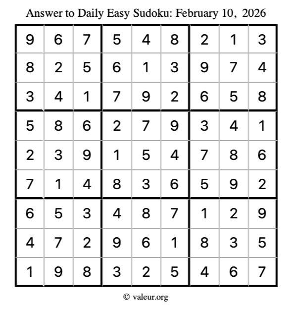 As promised, here is the solution to the February 10, 2026 easy sudoku puzzle: