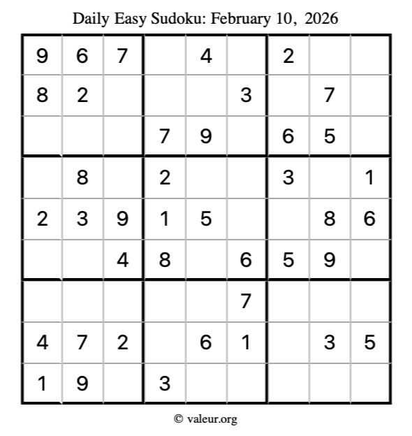 Here is the February 10, 2026 easy sudoku puzzle. You are welcome to print a copy to solve by hand. For your convenience, we have also included the solution further down the page so you can check your work.