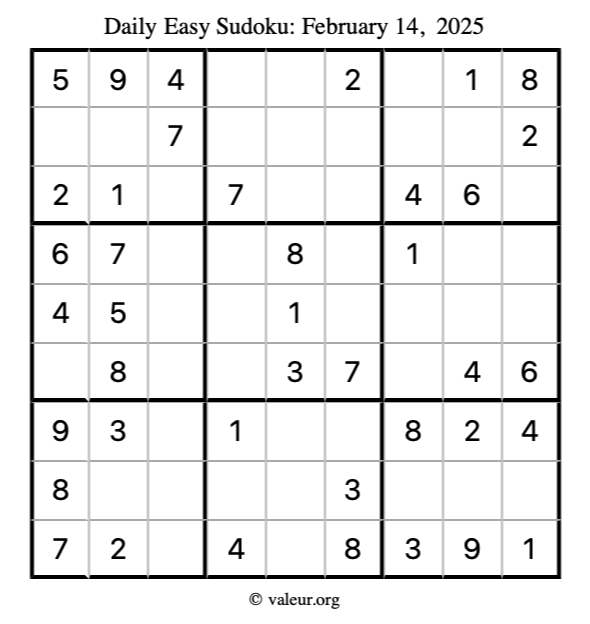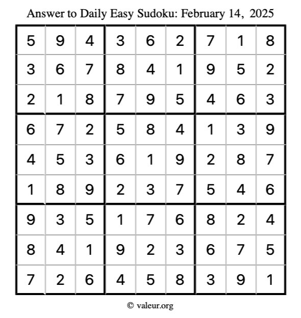 Here is the February 14, 2025 easy sudoku puzzle. You are welcome to print a copy to solve by hand. For your convenience, we have also included the solution further down the page so you can check your work.