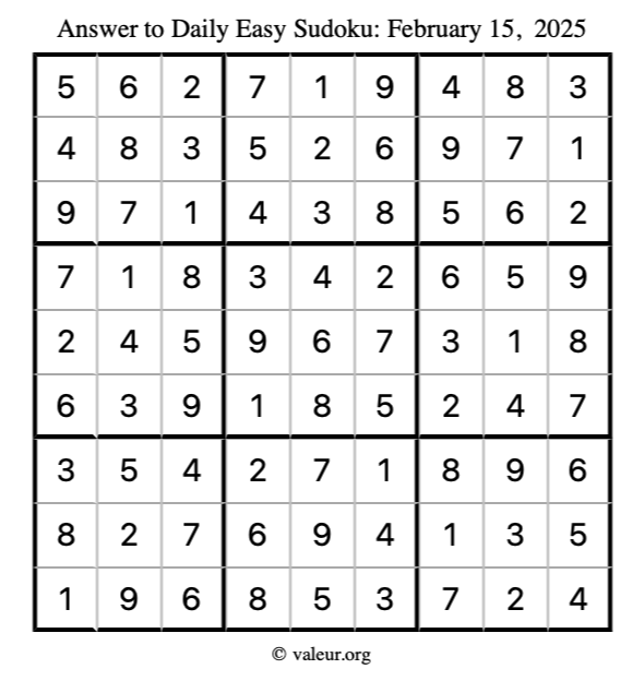 Here is the February 15, 2025 easy sudoku puzzle. You are welcome to print a copy to solve by hand. For your convenience, we have also included the solution further down the page so you can check your work.