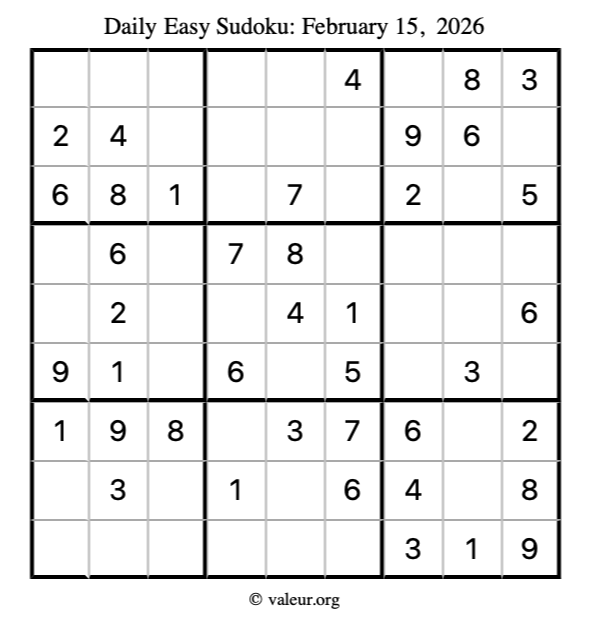 Here is the February 15, 2026 easy sudoku puzzle. You are welcome to print a copy to solve by hand. For your convenience, we have also included the solution further down the page so you can check your work.
