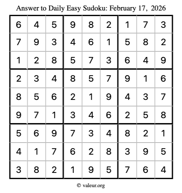 As promised, here is the solution to the February 17, 2026 easy sudoku puzzle: