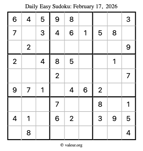 Here is the February 17, 2026 easy sudoku puzzle. You are welcome to print a copy to solve by hand. For your convenience, we have also included the solution further down the page so you can check your work.