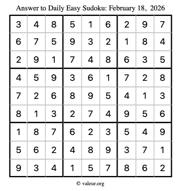 As promised, here is the solution to the February 18, 2026 easy sudoku puzzle: