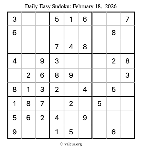 Here is the February 18, 2026 easy sudoku puzzle. You are welcome to print a copy to solve by hand. For your convenience, we have also included the solution further down the page so you can check your work.