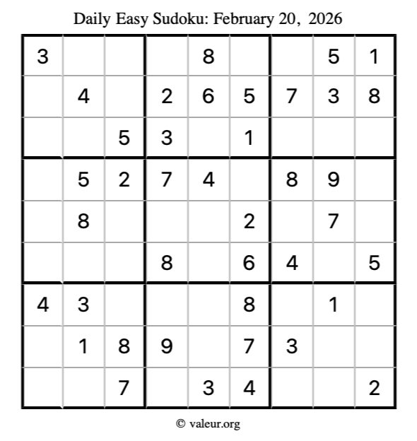 Here is the February 20, 2026 easy sudoku puzzle. You are welcome to print a copy to solve by hand. For your convenience, we have also included the solution further down the page so you can check your work.