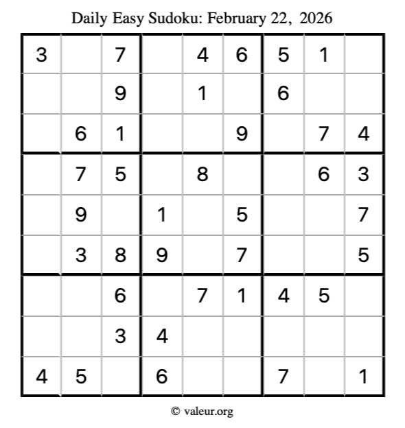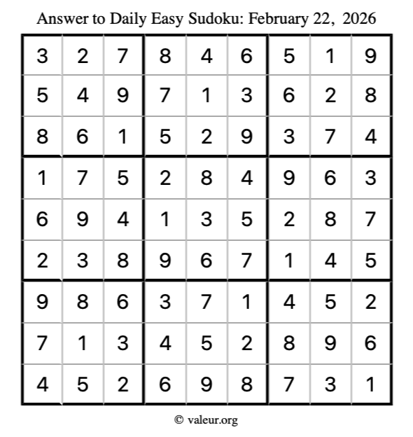 Here is the February 22, 2026 easy sudoku puzzle. You are welcome to print a copy to solve by hand. For your convenience, we have also included the solution further down the page so you can check your work.