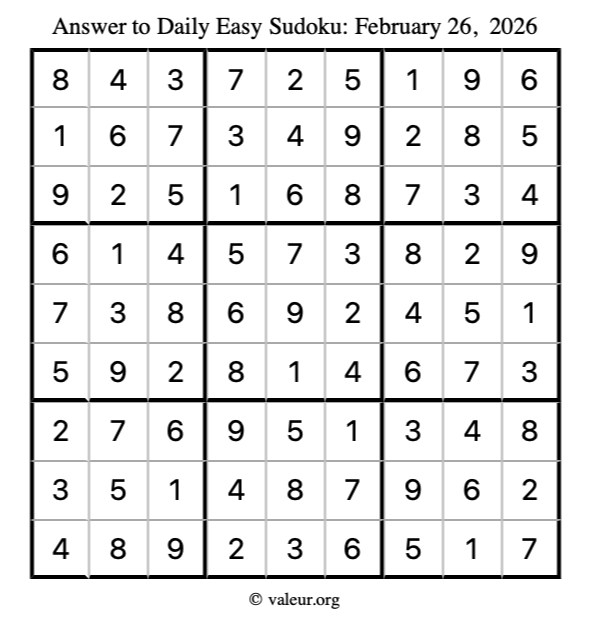 As promised, here is the solution to the February 26, 2026 easy sudoku puzzle: