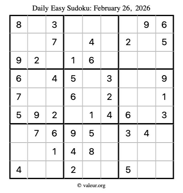 Here is the February 26, 2026 easy sudoku puzzle. You are welcome to print a copy to solve by hand. For your convenience, we have also included the solution further down the page so you can check your work.