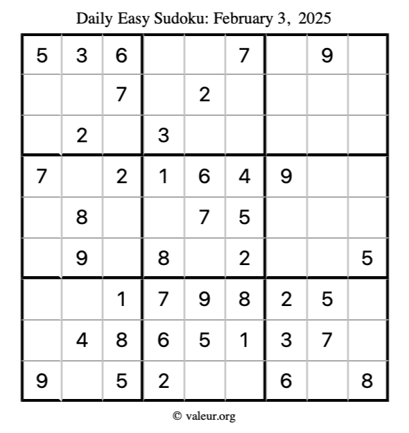 Here is the February 3, 2025 easy sudoku puzzle. You are welcome to print a copy to solve by hand. For your convenience, we have also included the solution further down the page so you can check your work.