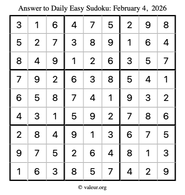 As promised, here is the solution to the February 4, 2026 easy sudoku puzzle: