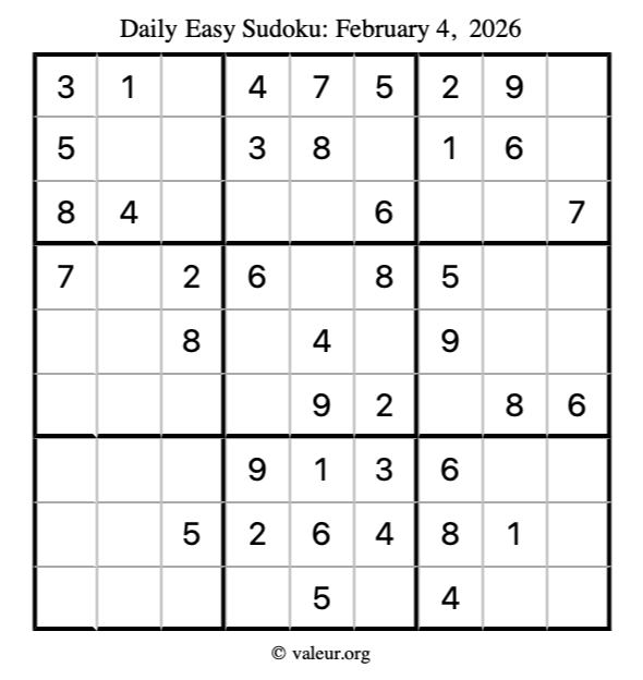 Here is the February 4, 2026 easy sudoku puzzle. You are welcome to print a copy to solve by hand. For your convenience, we have also included the solution further down the page so you can check your work.