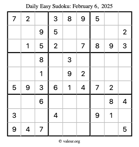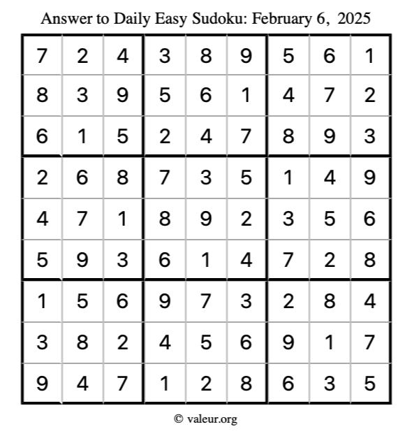 Here is the February 6, 2025 easy sudoku puzzle. You are welcome to print a copy to solve by hand. For your convenience, we have also included the solution further down the page so you can check your work.