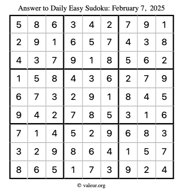 Here is the February 7, 2025 easy sudoku puzzle. You are welcome to print a copy to solve by hand. For your convenience, we have also included the solution further down the page so you can check your work.