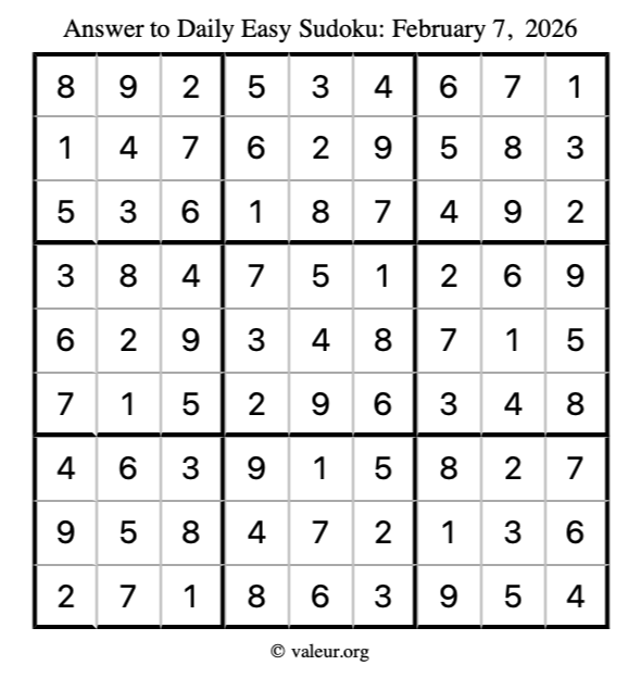 As promised, here is the solution to the February 7, 2026 easy sudoku puzzle: