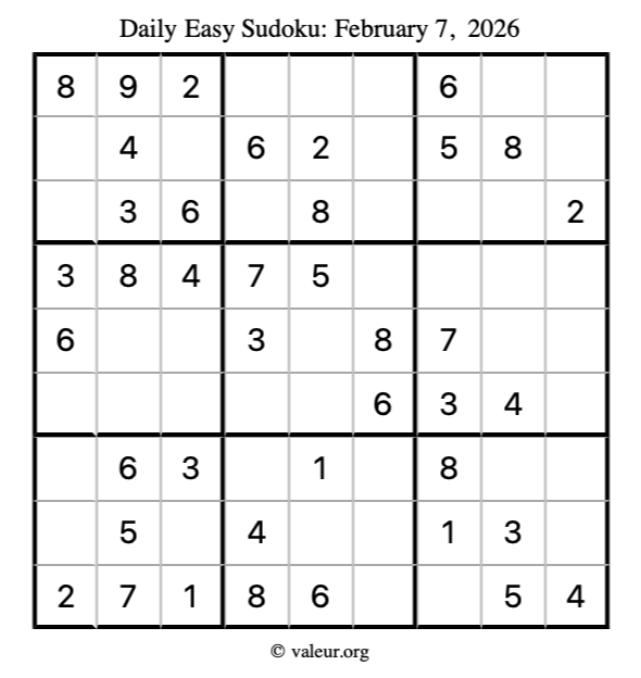 Here is the February 7, 2026 easy sudoku puzzle. You are welcome to print a copy to solve by hand. For your convenience, we have also included the solution further down the page so you can check your work.