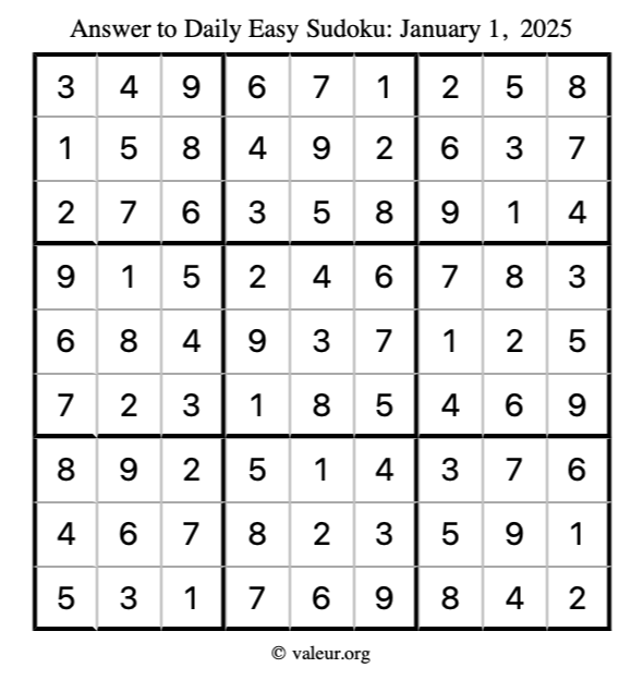 As promised, here is the solution to the January 1, 2025 easy sudoku puzzle: