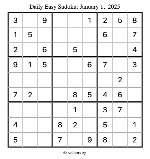 Here is the January 1, 2025 easy sudoku puzzle. You are welcome to print a copy to solve by hand. For your convenience, we have also included the solution further down the page so you can check your work.