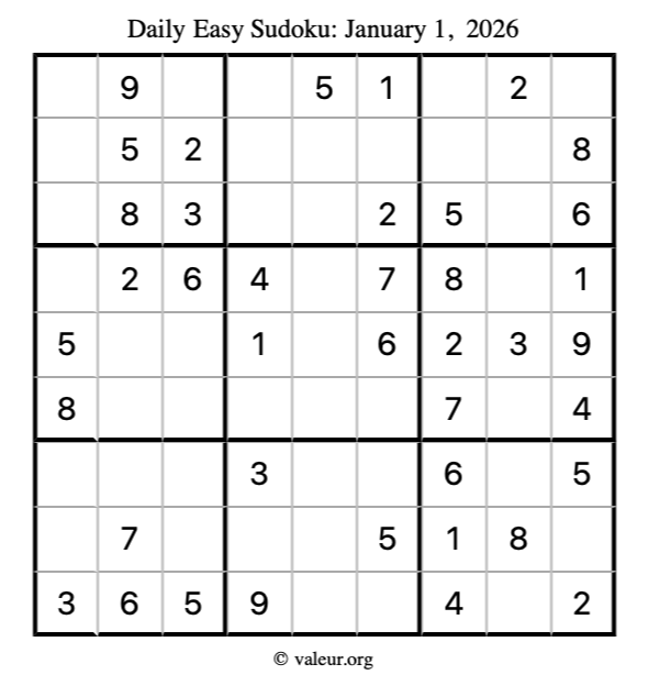 Here is the January 1, 2026 easy sudoku puzzle. You are welcome to print a copy to solve by hand. For your convenience, we have also included the solution further down the page so you can check your work.