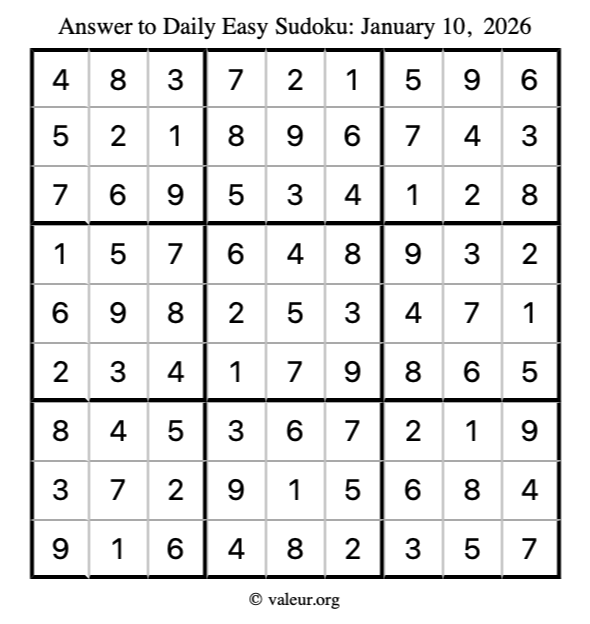 As promised, here is the solution to the January 10, 2026 easy sudoku puzzle: