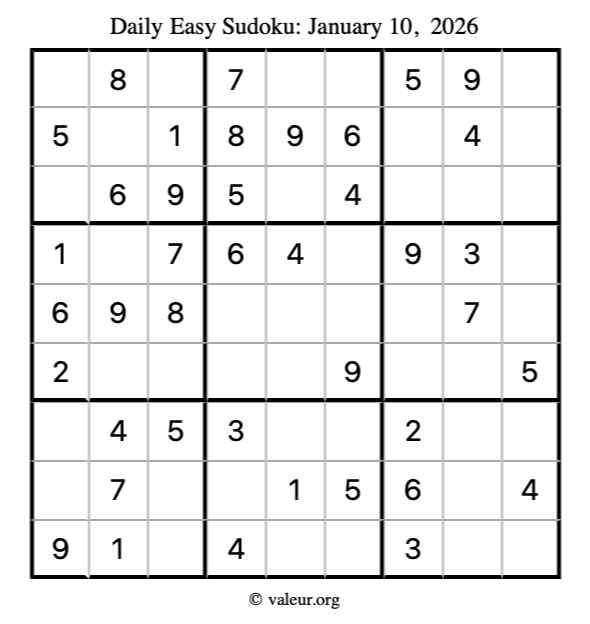 Here is the January 10, 2026 easy sudoku puzzle. You are welcome to print a copy to solve by hand. For your convenience, we have also included the solution further down the page so you can check your work.