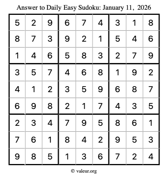 As promised, here is the solution to the January 11, 2026 easy sudoku puzzle: