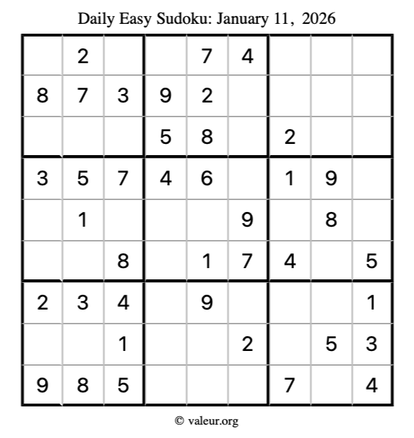 Here is the January 11, 2026 easy sudoku puzzle. You are welcome to print a copy to solve by hand. For your convenience, we have also included the solution further down the page so you can check your work.