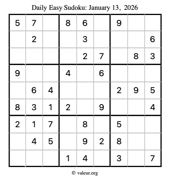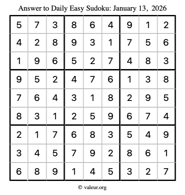 Here is the January 13, 2026 easy sudoku puzzle. You are welcome to print a copy to solve by hand. For your convenience, we have also included the solution further down the page so you can check your work.