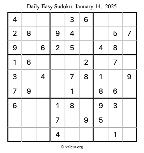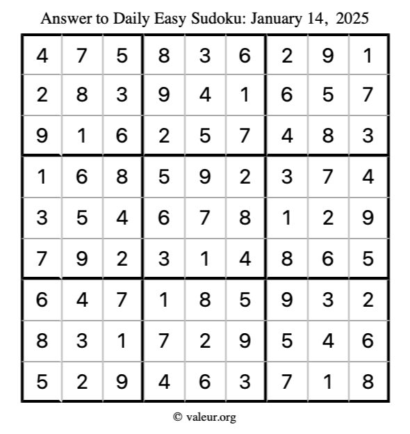 Here is the January 14, 2025 easy sudoku puzzle. You are welcome to print a copy to solve by hand. For your convenience, we have also included the solution further down the page so you can check your work.
