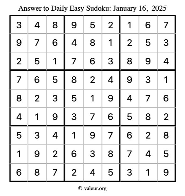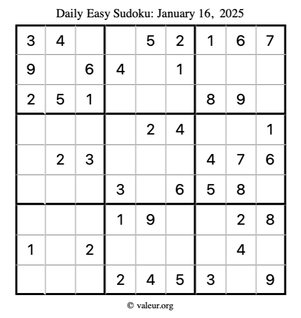 Here is the January 16, 2025 easy sudoku puzzle. You are welcome to print a copy to solve by hand. For your convenience, we have also included the solution further down the page so you can check your work.