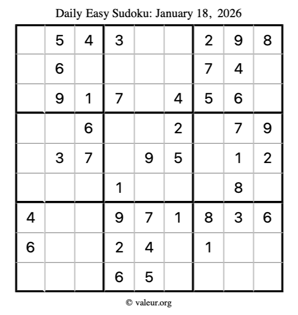 Here is the January 18, 2026 easy sudoku puzzle. You are welcome to print a copy to solve by hand. For your convenience, we have also included the solution further down the page so you can check your work.