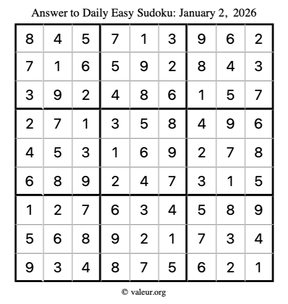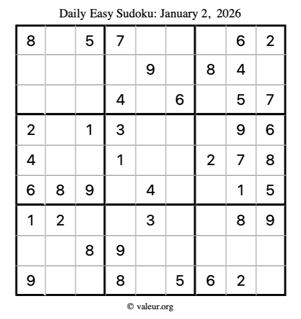 Here is the January 2, 2026 easy sudoku puzzle. You are welcome to print a copy to solve by hand. For your convenience, we have also included the solution further down the page so you can check your work.