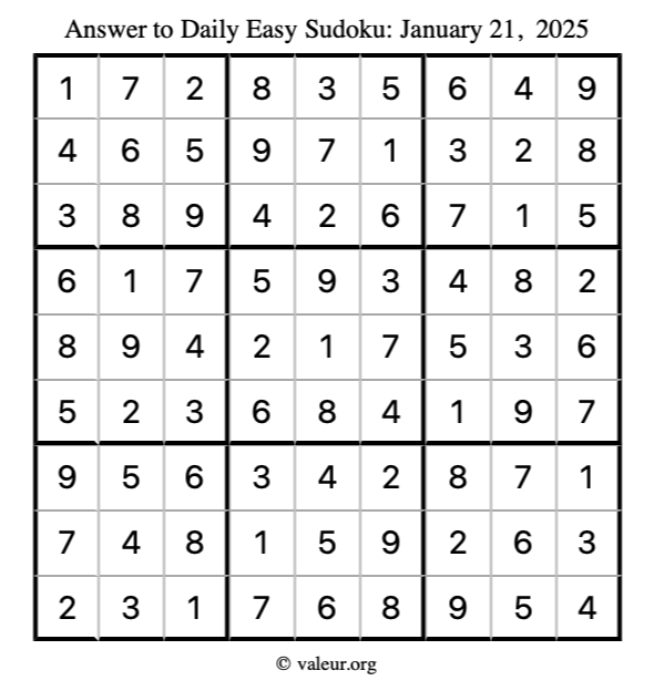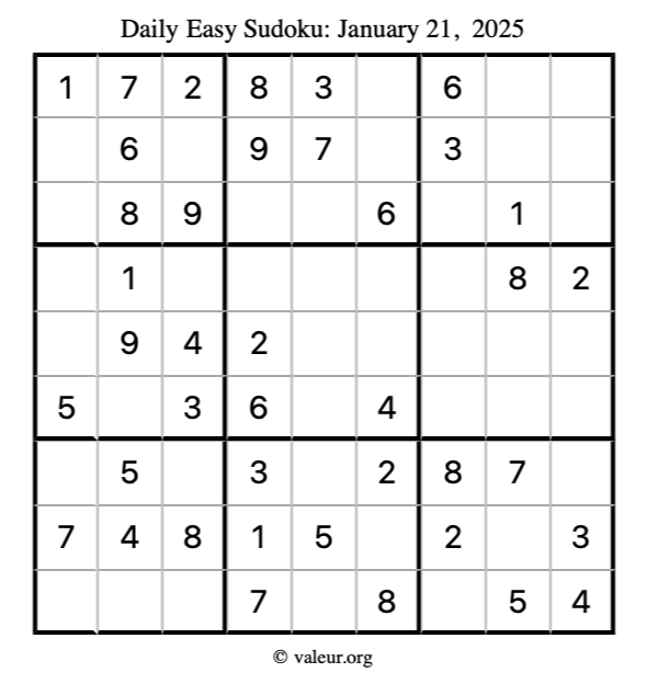 Here is the January 21, 2025 easy sudoku puzzle. You are welcome to print a copy to solve by hand. For your convenience, we have also included the solution further down the page so you can check your work.